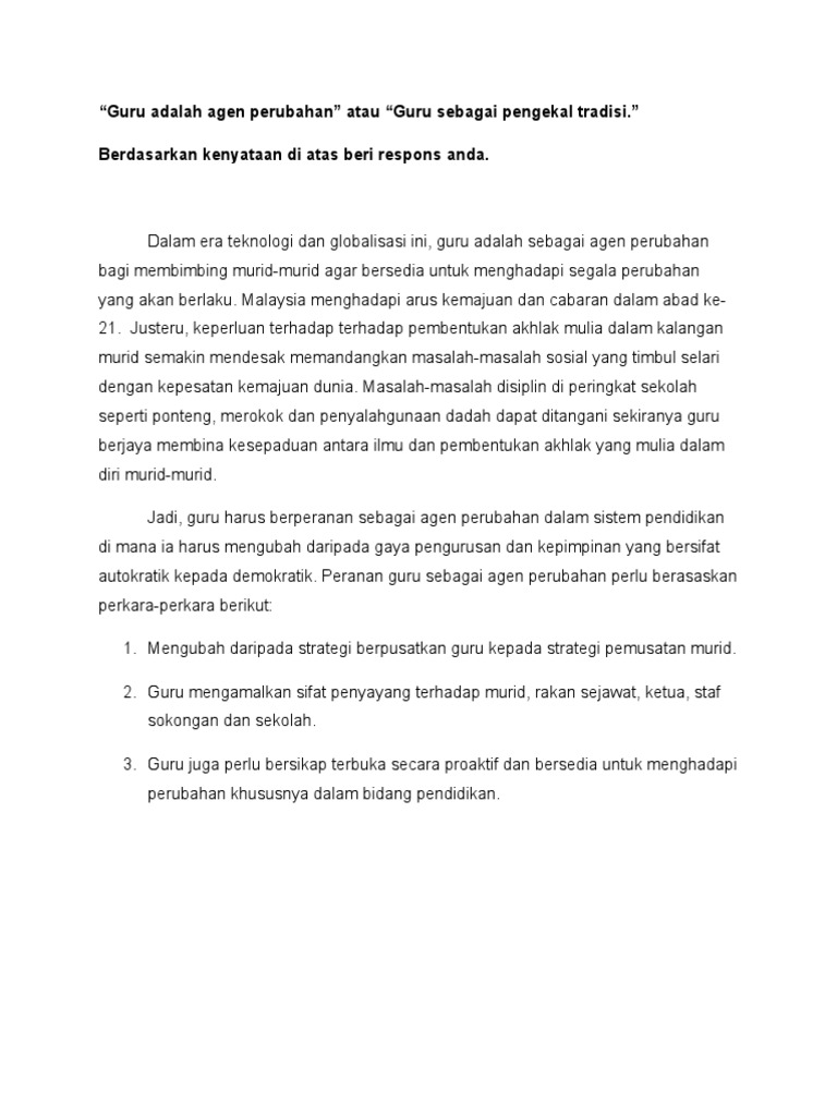 Guru sebagai Agen Perubahan. Sehingga sebagai sosok professional yang telah. Perubahan Malaysia menghadapi arus kemajuan dan cabaran dalam abad ke 21.